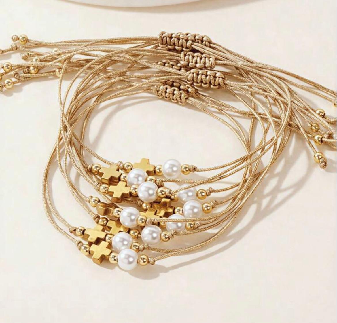 - Diseño con cruz dorada, perla blanca y cuentas dorada